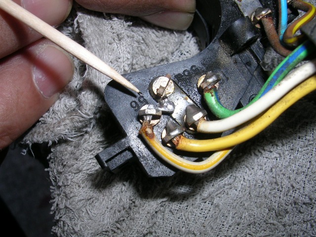 まずは「下向き」の件は、ヘッドライトスイッチの接触不良で接点が過熱、リード線を取り付けてあるハンダが溶けて隣の接点にブリッジしてしまったためでした。ハンダブリッジを除去、スイッチ接点を分解して接触不良を直して完了。