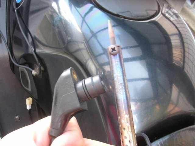 ふむふむ・・・勿論近づけるのはコテ「先」ではなく「胴」ですね、ここを「装着状態ピックアップ」に対して、車体前後方向に真横から、コテ先を前方にして近づけて?上下・前後に動かすと、一瞬ピンと来るので、メーターを見ながらポイントを絞り込んで行くと?スゥゥッと60km辺りまで振れて来ましたよん 8) 。。   IGはONね!