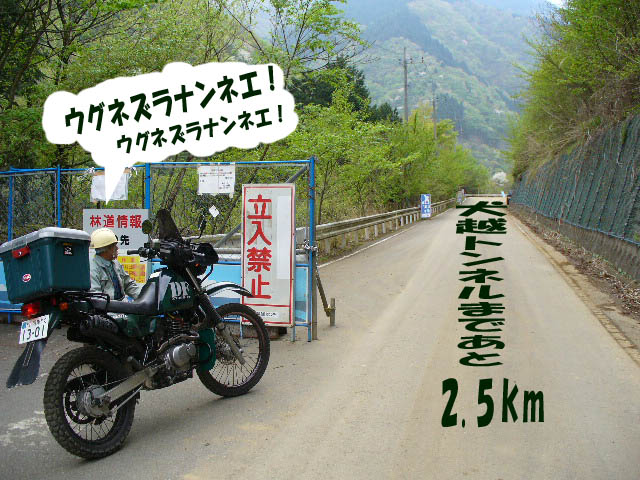 そして犬越路トンネルにあと2.5kmの所で工事ゲートに遭遇、誰もいないので突破しようとしたその時、