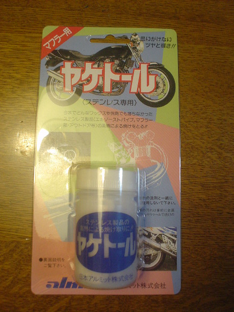 最近かなりキテいる汚エキゾーストパイプを磨いてみました。色々情報収集してみたところ、ヤケトール、というケミカルが良いらしく、ナップスで買ってきました。お値段は確か1000円位でした。